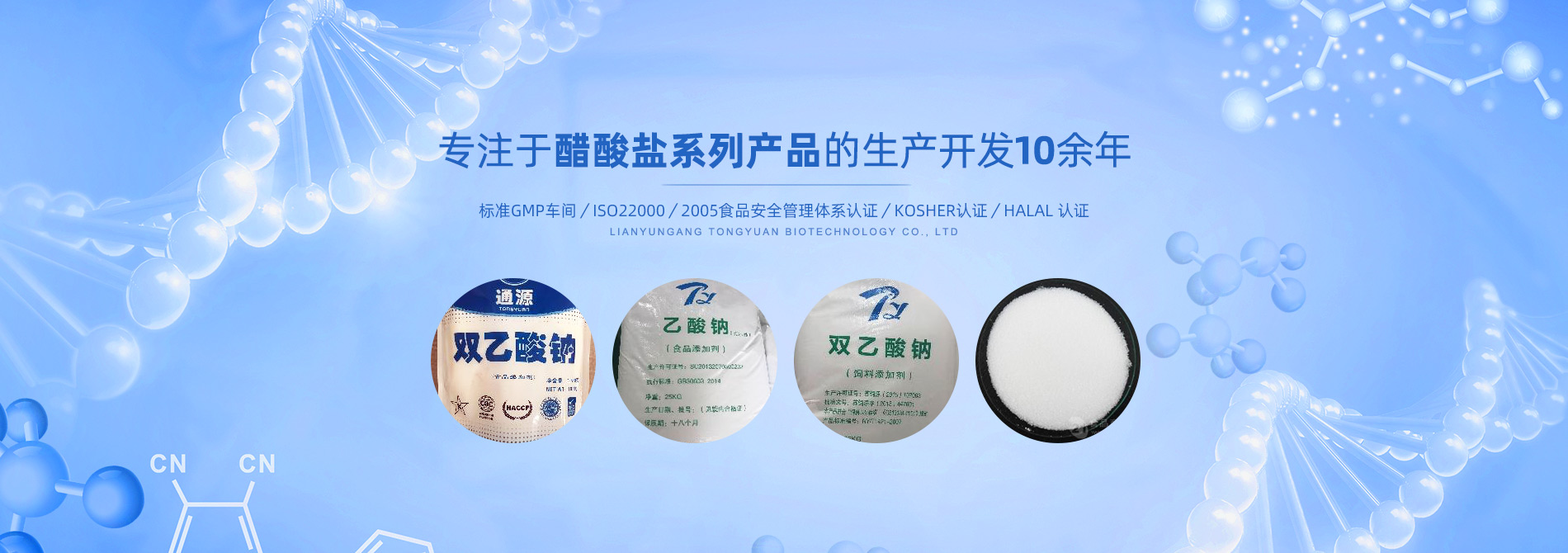 連云港市通源生物科技有限公司 是生產雙乙酸鈉、無水醋酸鈉、三水醋酸鈉、醋酸鉀、乙酸鈉、丙酸鈉、丙酸鈣和氯化鉀等系類醋酸鹽產品的專業制造商。公司專注于醋酸鹽系列產品的生產開發10余年,是國內專業醋酸酸鹽產品生產基地?! ∧壳?,我們已和全球30多個國家和地區建立長期的業務合作關系,是中國較大的雙乙酸鈉生產商和出口商之一。作為中國食品添加劑和配料協會理事單位,通源公司已建成標準GMP車間5000余平方米,通過了ISO22000:2005食品安全管理體系認證、KOSHER認證、HALAL 認證等,這些都是我們提供高質量產品和優良服務的前提和確保?! ∩a出色產品,提供優良服務,滿足顧客需要,是我們努力的目標。愿和我們的朋友們攜手,共...